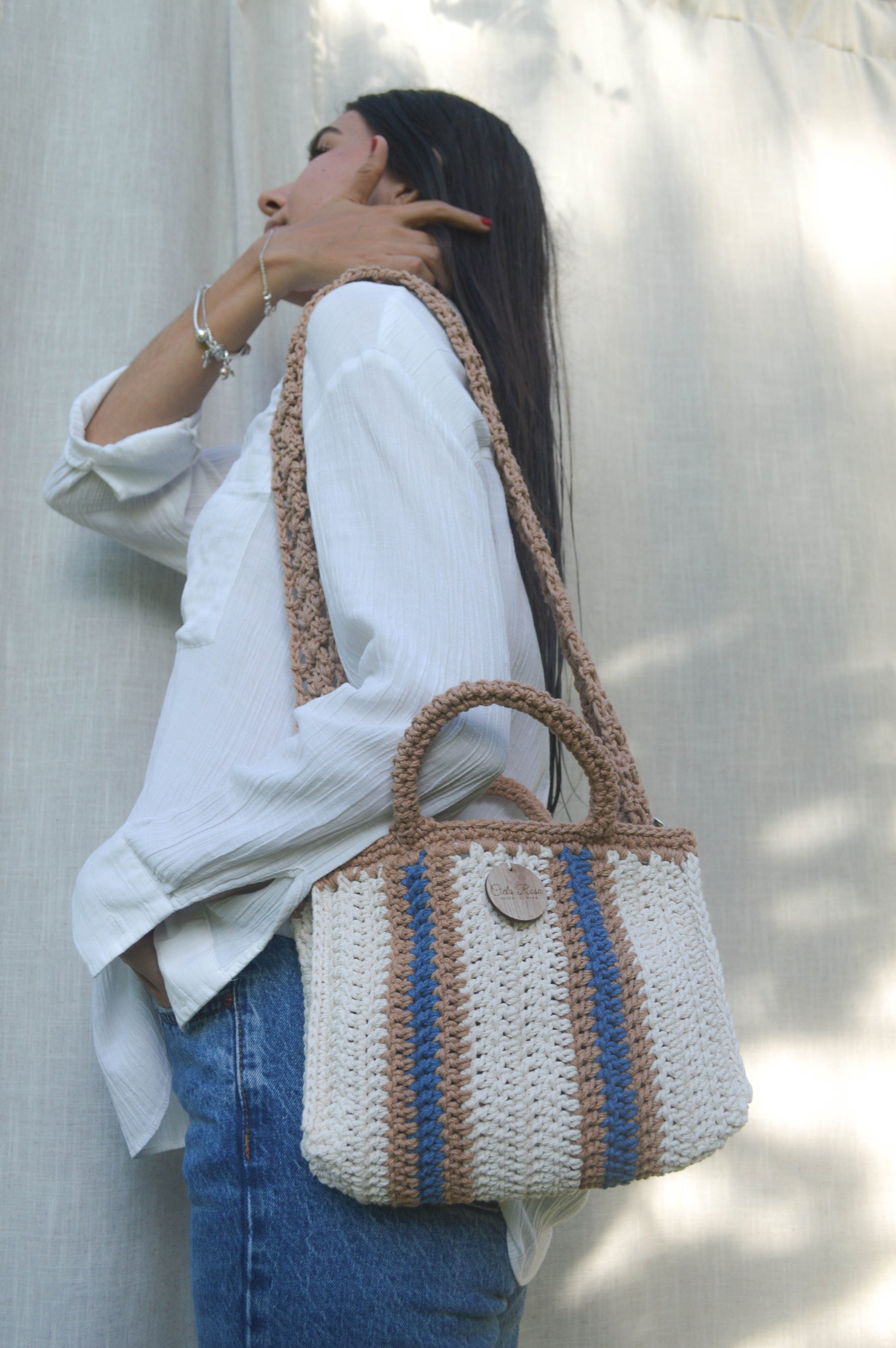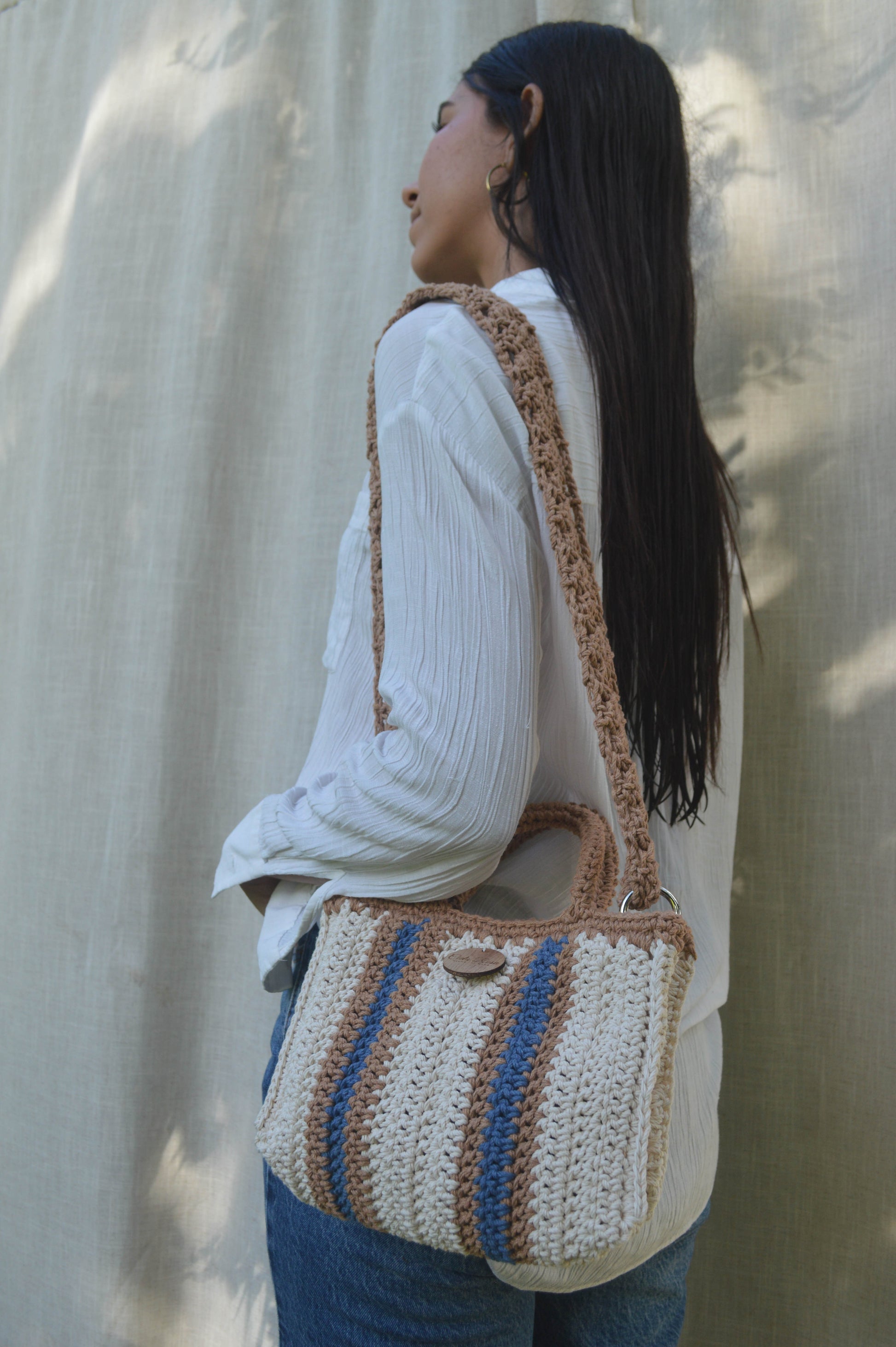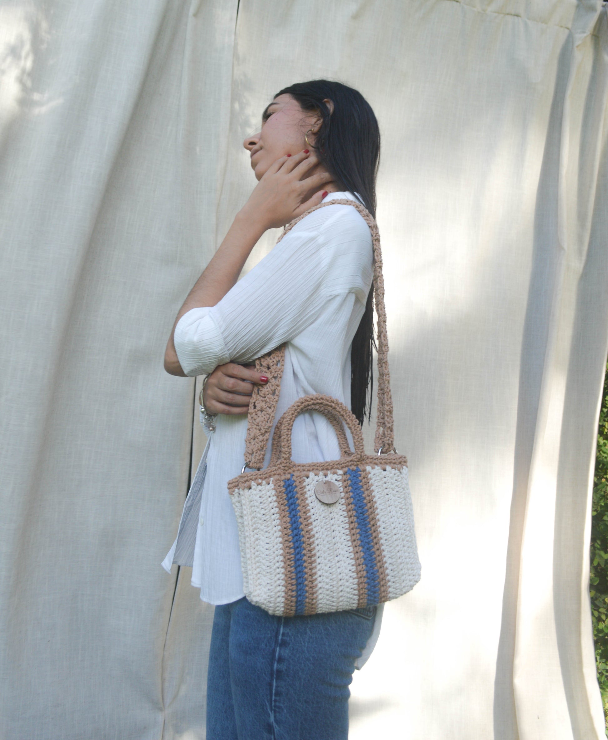 Mini tejida a mano en hilo de algodón. Forrada en su interior, cierra con botón de imán.