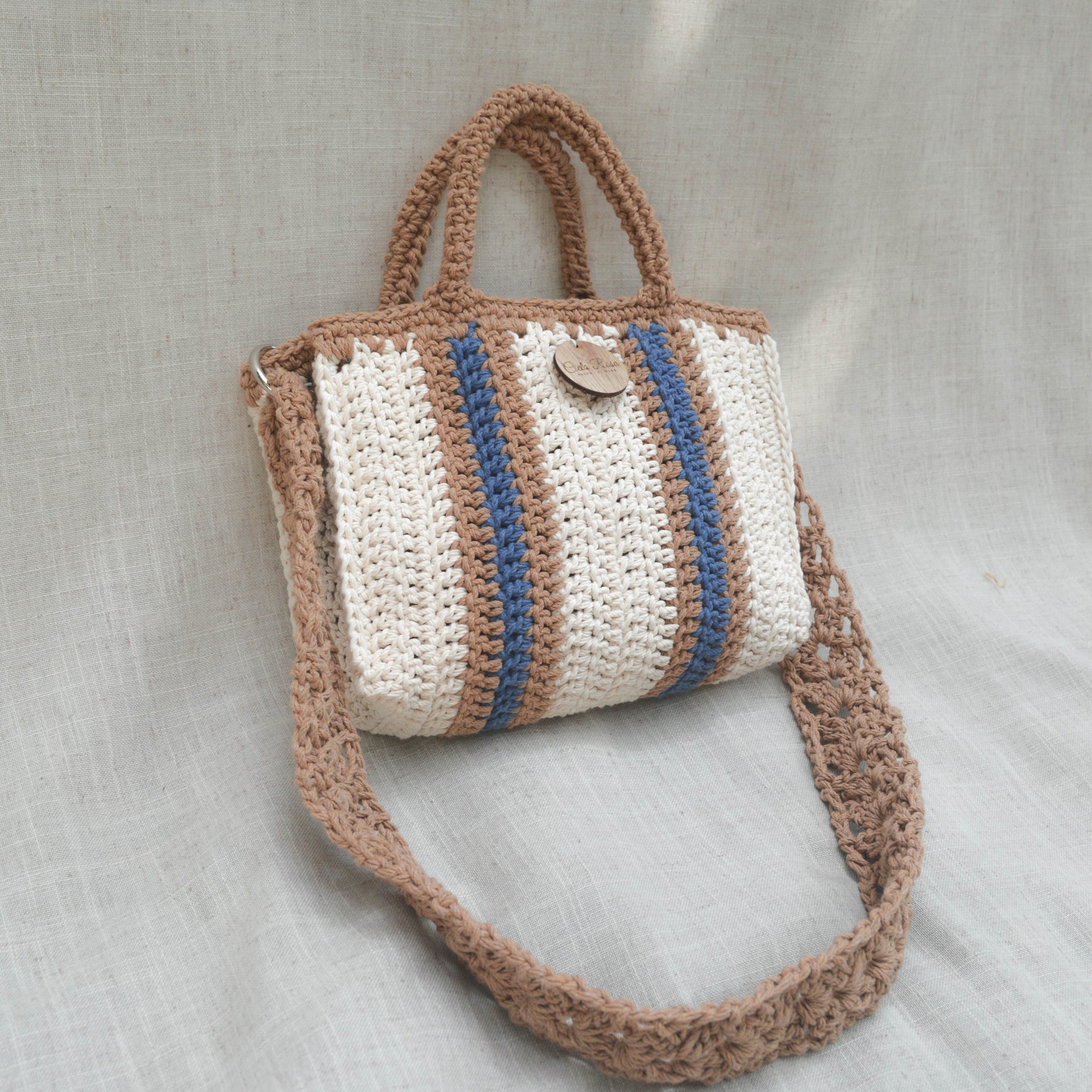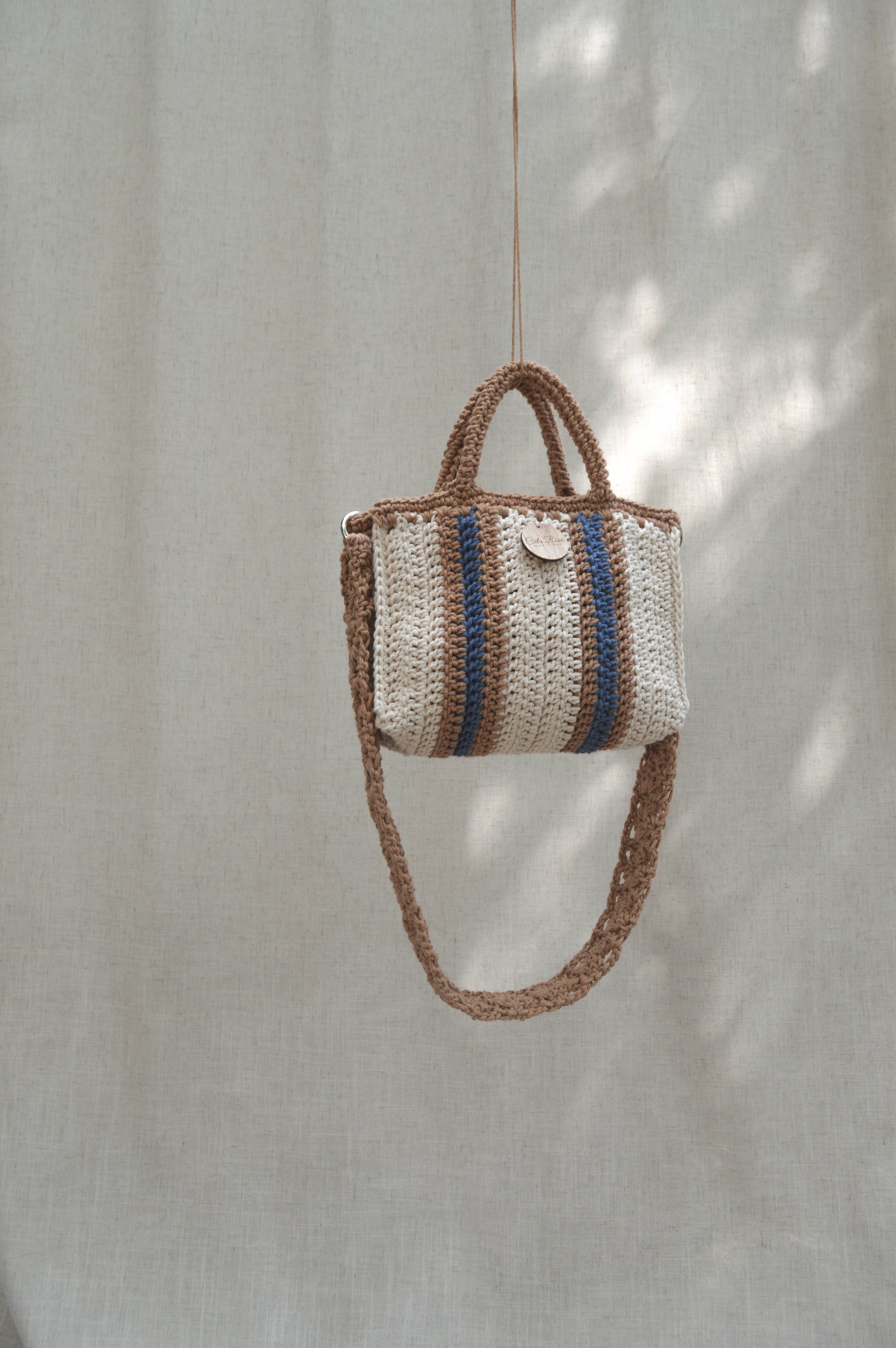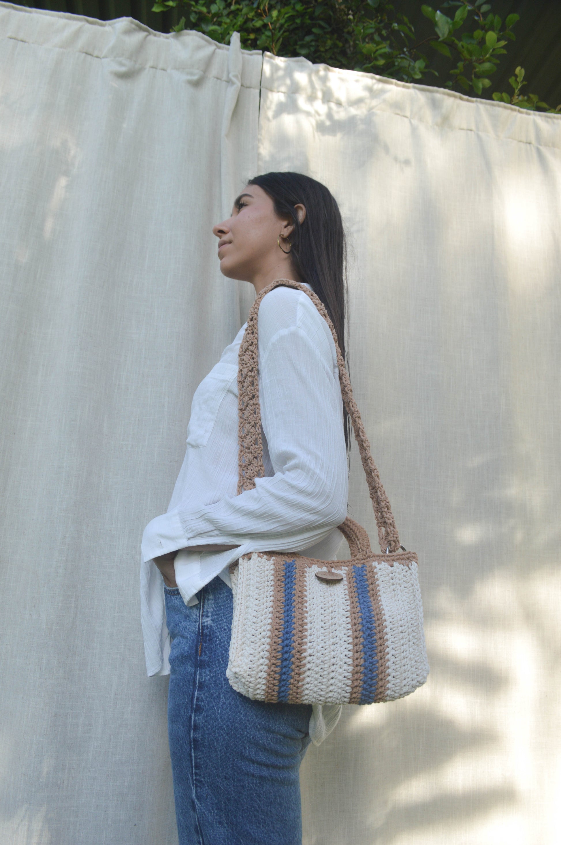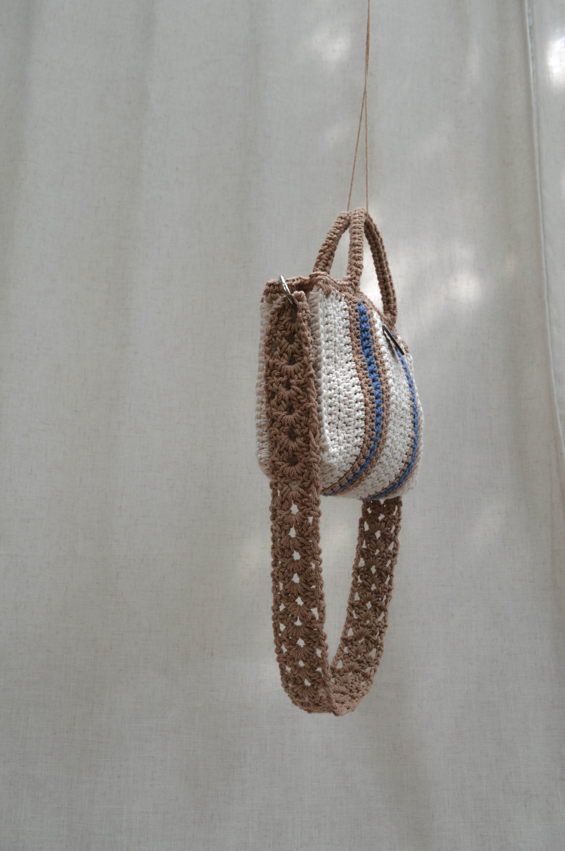 Mini tejida a mano en hilo de algodón. Forrada en su interior, cierra con botón de imán.